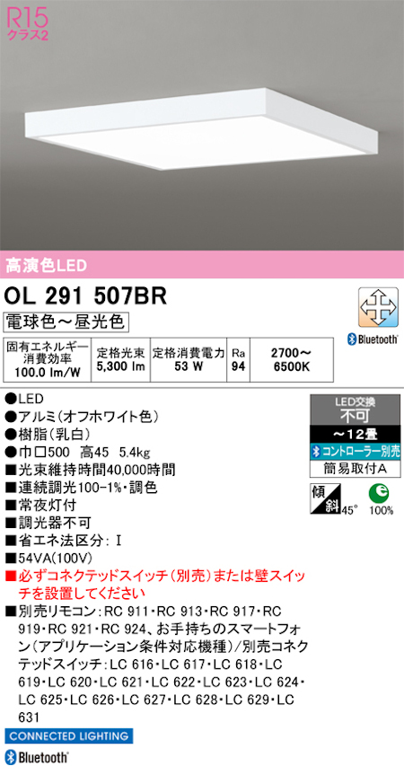 オーデリック OL291507BR 超薄型LEDシーリングライト角型~12畳 R15クラス2調光・調色タイプ 電球色~電光色 オフホワイト