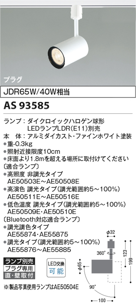 コイズミ照明 AS93585 スポットライト JDR65W/40W相当 ダイクロイックハロゲン球形 プラグタイプ ランプ別売 ファインホワイト