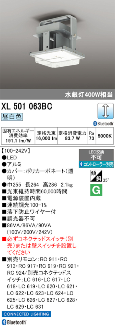 オーデリック XL501063BC LED高天井用シーリング Bluetooth 調光型 水銀灯400W相当 昼白色 リモコン別売