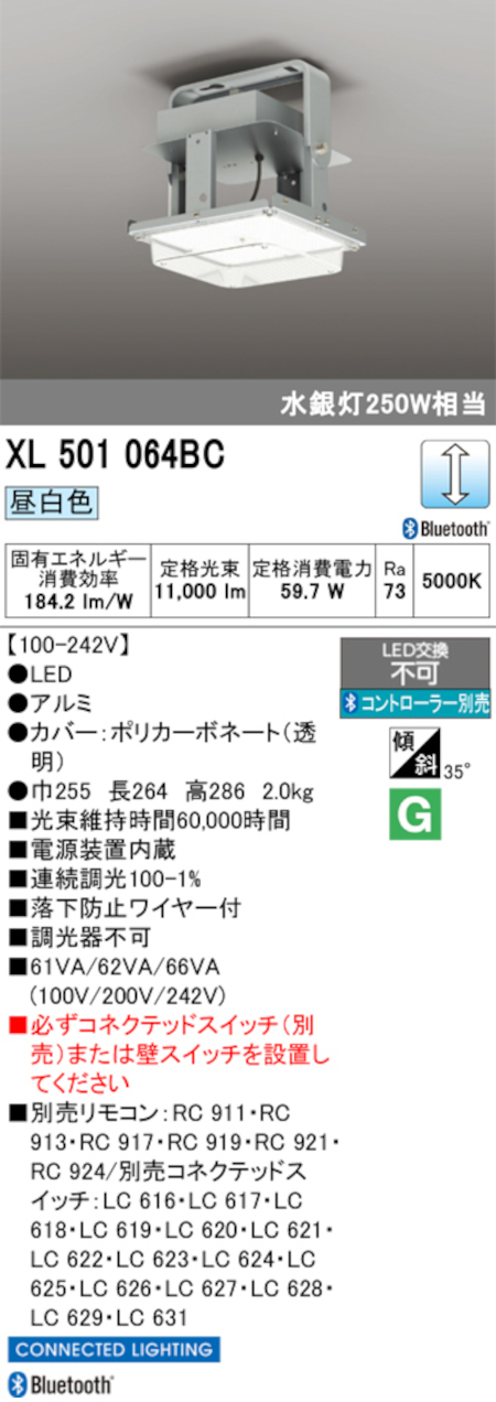 オーデリック XL501064BC LED高天井用シーリング Bluetooth 調光型 水銀灯250W相当 昼白色 リモコン別売