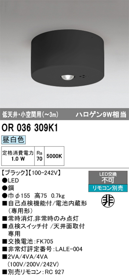 オーデリック OR036309K1 非常灯 直付型 低天井・小空間~3m ハロゲン9W相当 昼白色 ブラック