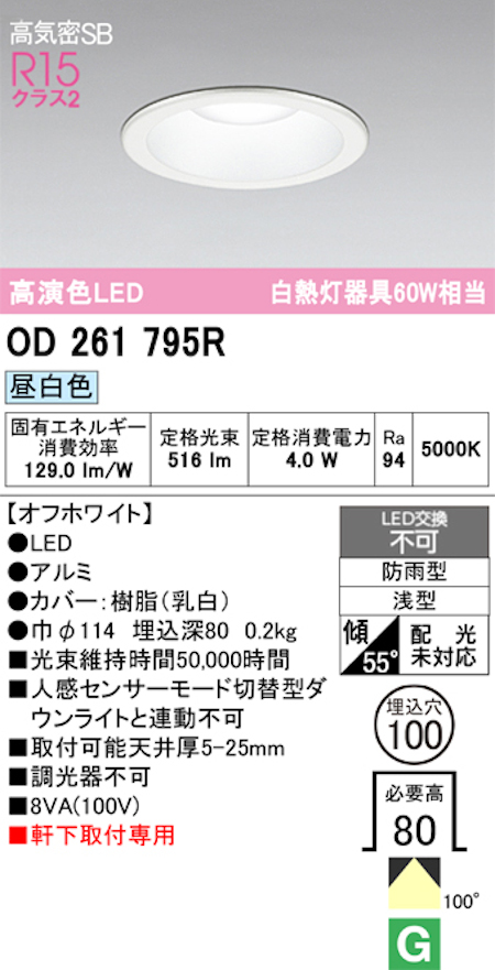 オーデリック OD261795R 軒下用LEDダウンライト防雨型 非調光 白熱灯器具60W相当 昼白色 オフホワイト