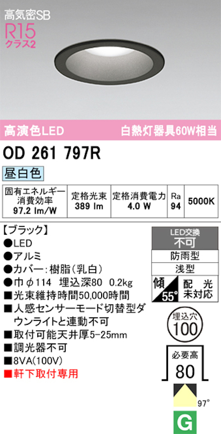オーデリック OD261797R 軒下用LEDダウンライト防雨型 非調光 白熱灯器具60W相当 昼白色 ブラック