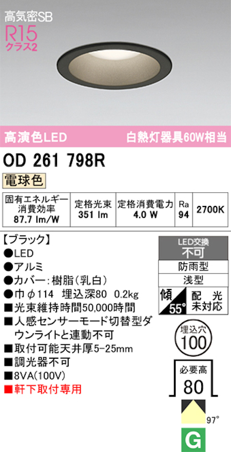 オーデリック OD261798R 軒下用LEDダウンライト防雨型 非調光 白熱灯器具60W相当 電球色 ブラック