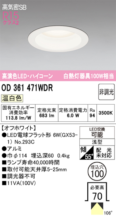 オーデリック OD361471WDR LED電球ダウンライト Φ100 高気密SB形 非調光R15クラス 2白熱灯100W相当 温白色