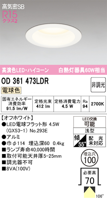 オーデリック OD361473LDR LED電球ダウンライト Φ100 高気密SB形 非調光R15クラス 2白熱灯60W相当 電球色
