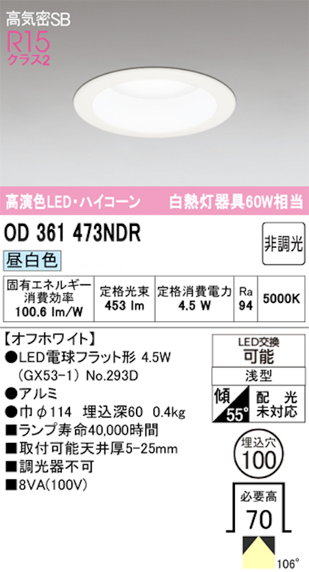 オーデリック OD361473NDR LED電球ダウンライト Φ100 高気密SB形 非調光R15クラス 2白熱灯60W相当 昼白色