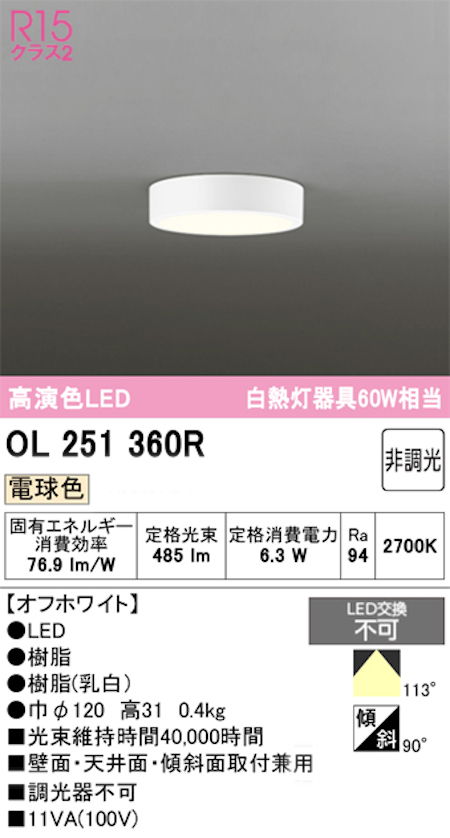 オーデリック OL251360R 小型LEDシーリングライト 非調光 白熱灯器具60W相当 電球色
