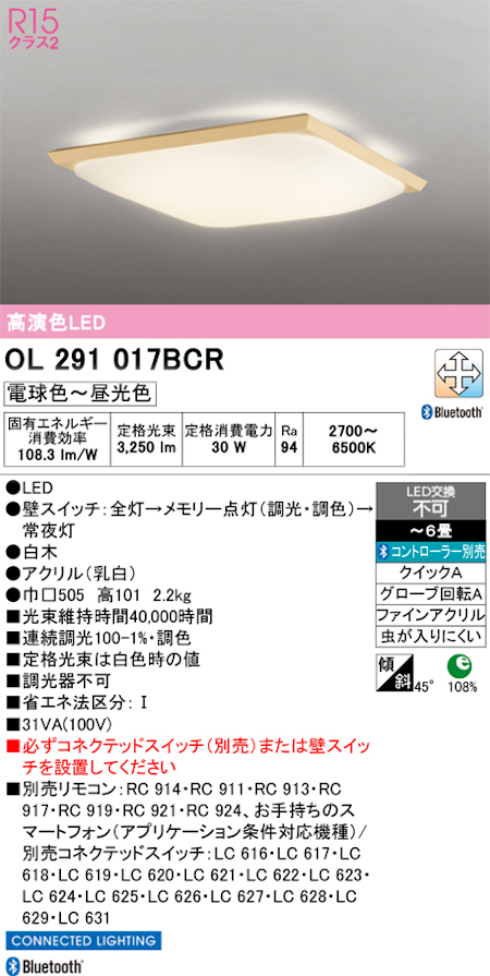 オーデリック OL291017BCR 和風LEDシーリングライト~6畳用 白木枠セード R15クラス2調光・調色タイプ 電球色~昼光色 コントローラー別売