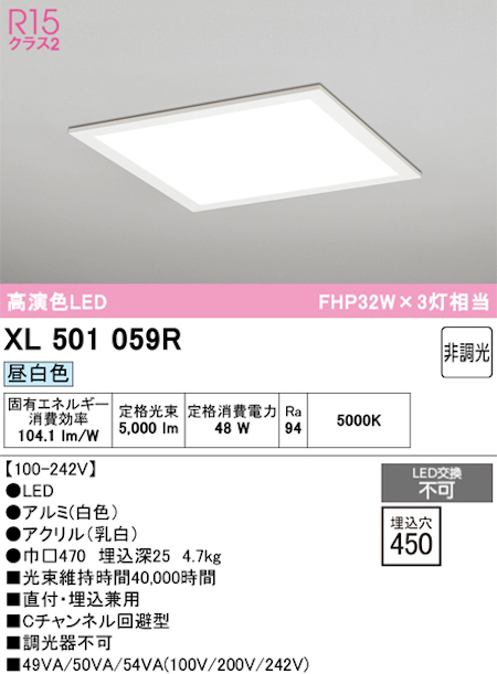 オーデリック XL501059R LEDスクエア型ベースライト 直付・埋込兼用型 FHP45Wx3灯相当 非調光タイプ 光束9000lm 昼白色