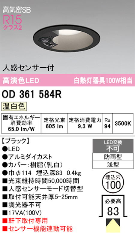オーデリック OD361584R 軒下用LEDダウンライト防雨型 人感センサーモード切替型 白熱灯器具100W相当 温白色 ブラック