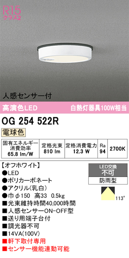 オーデリック OG254522R 軒下用シーリングライト 防雨型人感センサーON-OFF型 白熱灯100W相当 電球色 オフホワイト