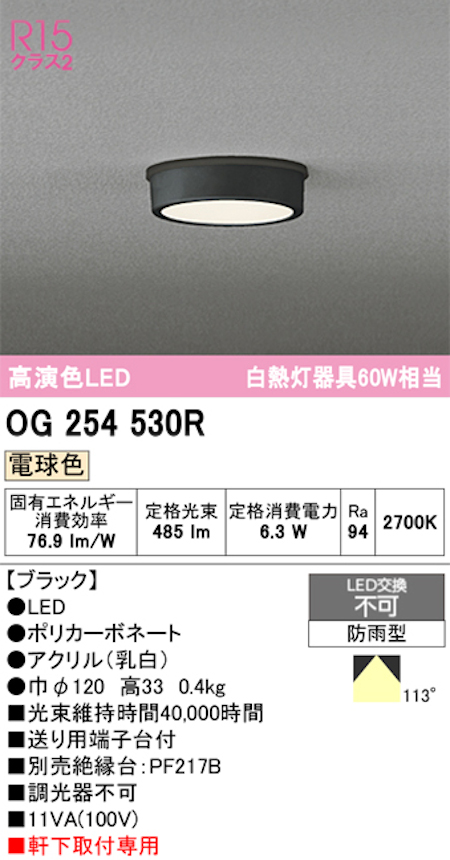 オーデリック OG254530R 軒下用シーリングライト 防雨型 白熱灯60W相当 電球色 ブラック