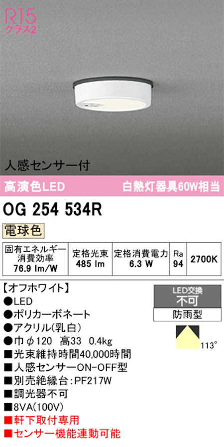オーデリック OG254534R 軒下用シーリングライト 防雨型人感センサーON-OFF型 白熱灯60W相当 電球色 オフホワイト