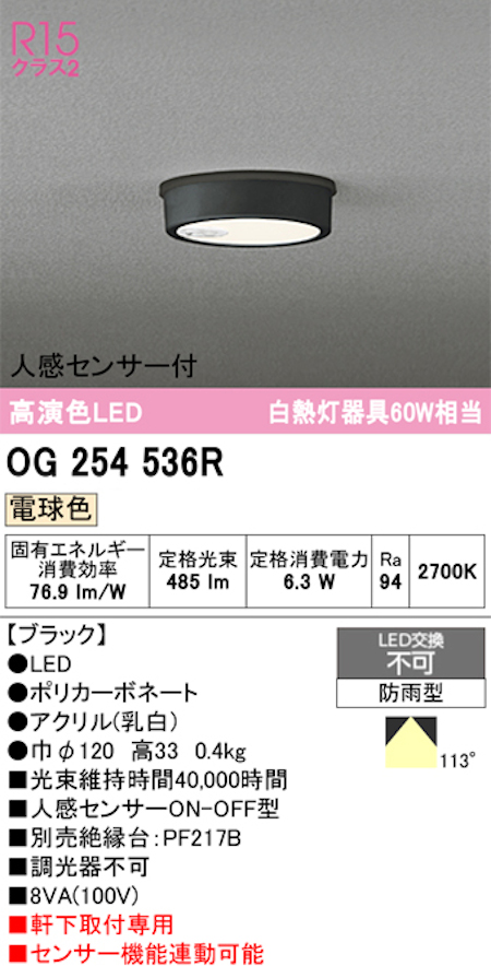 オーデリック OG254536R 軒下用シーリングライト 防雨型人感センサーON-OFF型 白熱灯60W相当 電球色 ブラック
