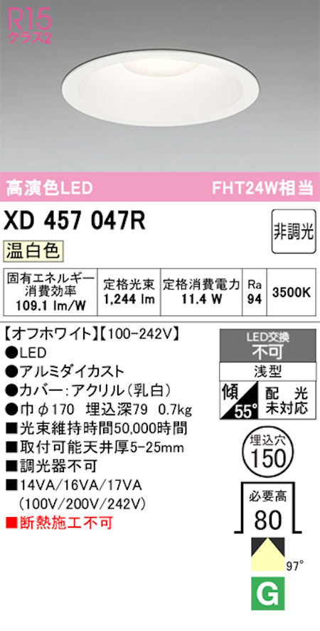 オーデリック XD457047R LED一体型ダウンライト Φ150 非調光 FHT24W相当 温白色 オフホワイト