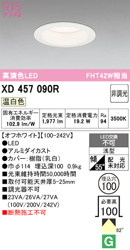 オーデリック XD457090R LED一体型ダウンライト Φ100 非調光 FHT42W相当 温白色 オフホワイト