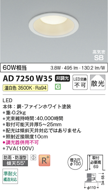 コイズミ照明 AD7250W35 S形白枠ダウンライト 100φ 準耐火構造対応 防雨・防湿型 60W相当 非調光 温白色