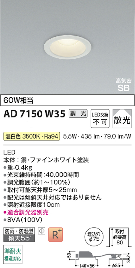 コイズミ照明 AD7150W35 S形白枠ダウンライト 75φ 準耐火構造対応 防雨・防湿型 60W相当 調光 温白色