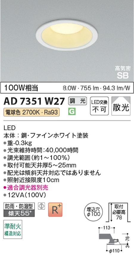 コイズミ照明 AD7351W27 S形白枠ダウンライト 100φ 準耐火構造対応 防雨・防湿型 100W相当 調光 電球色