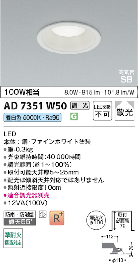 コイズミ照明 AD7351W50 S形白枠ダウンライト 100φ 準耐火構造対応 防雨・防湿型 100W相当 調光 昼白色