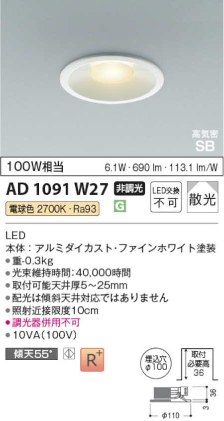 コイズミ照明 AD1091W27 S形浅型ダウンライト 100φ 非調光 100W相当 電球色