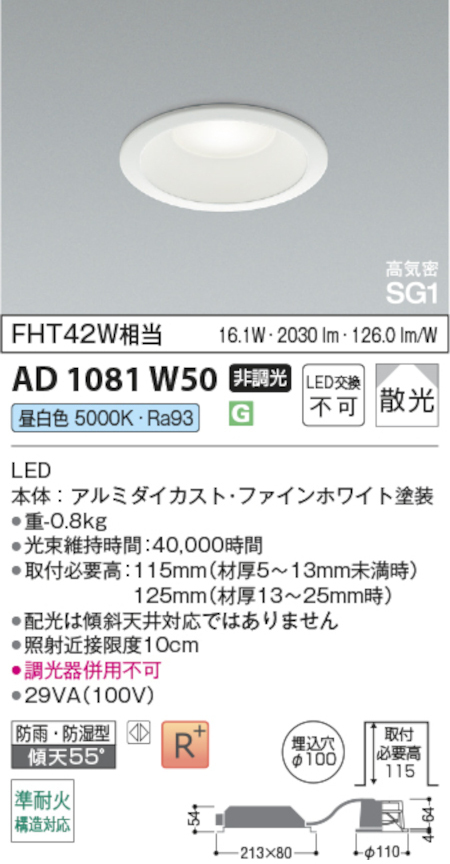 コイズミ照明 AD1081W50 S形ハイパワータイプ高天井・大空間用ダウンライト 100φ FHT42W相当 非調光 防雨・防湿型 昼白色