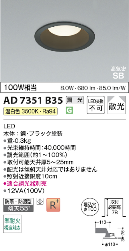 コイズミ照明 AD7351B35 S形黒枠ダウンライト 100φ 準耐火構造対応 防雨・防湿型 100W相当 調光 電球色