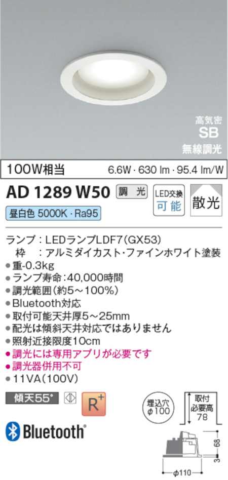 コイズミ照明 AD1289W50 Bluetooth?対応ランプ搭載ダウンライト 100φ 無線調光 100W相当 昼白色
