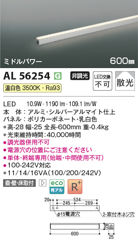 コイズミ照明 AL56254 間接照明 ライトバー 非調光 600mm 温白色