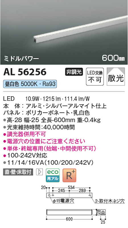 コイズミ照明 AL56256 間接照明 ライトバー 非調光 600mm 昼白色