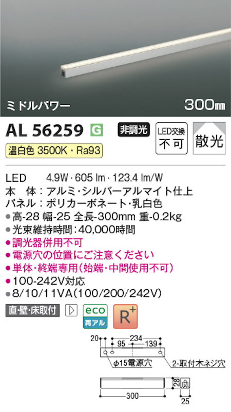 コイズミ照明 AL56259 間接照明 ライトバー 非調光 300mm 温白色