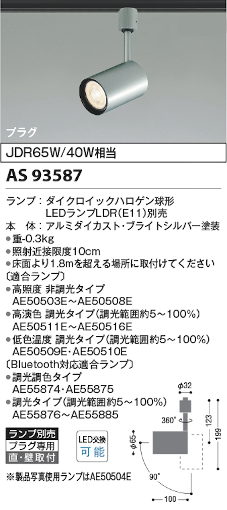 コイズミ照明 AS93587 スポットライト JDR65W/40W相当 ダイクロイックハロゲン球形 プラグタイプ ランプ別売 ブライトシルバー