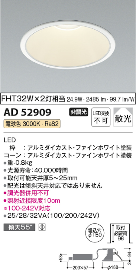 コイズミ照明 AD52909 M型コンフォートベースダウンライト 非調光 埋込穴Φ150 FHT32W×2灯相当 電球色
