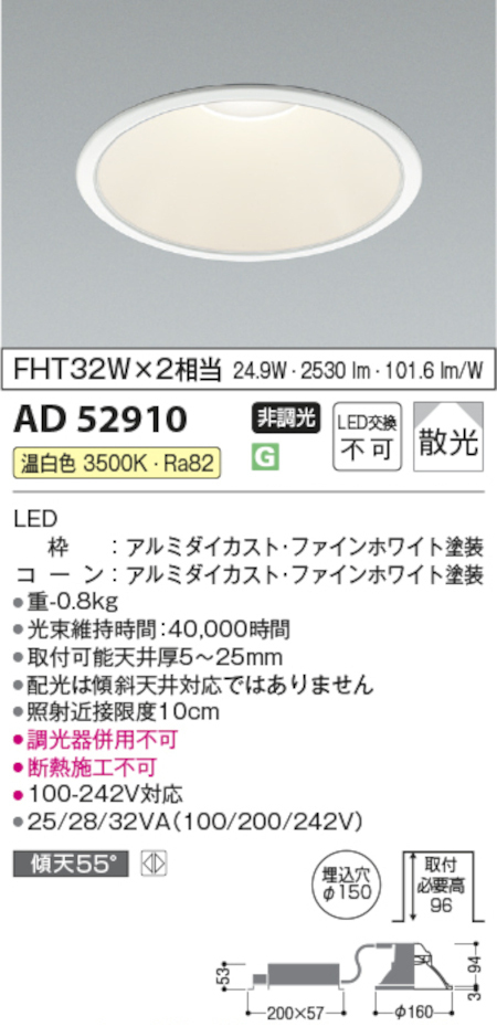 コイズミ照明 AD52910 M型コンフォートベースダウンライト 非調光 埋込穴Φ150 FHT32W×2灯相当 温白色