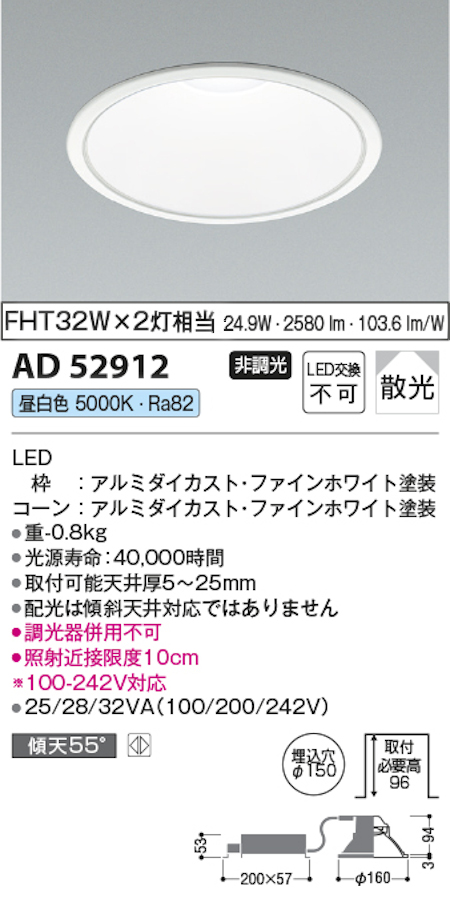 コイズミ照明 AD52912 M型コンフォートベースダウンライト 非調光 埋込穴Φ150 FHT32W×2灯相当 昼白色
