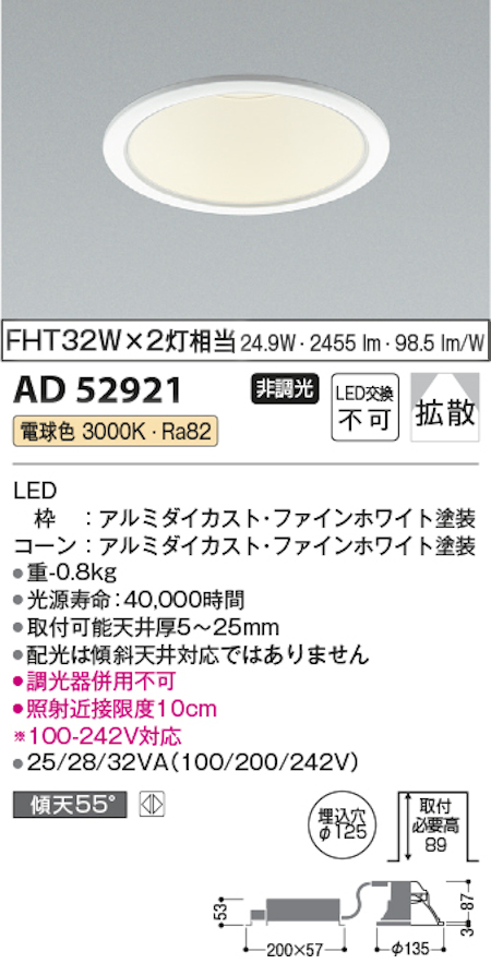 コイズミ照明 AD52921 M型コンフォートベースダウンライト 非調光 埋込穴Φ125 FHT32W×2灯相当 電球色