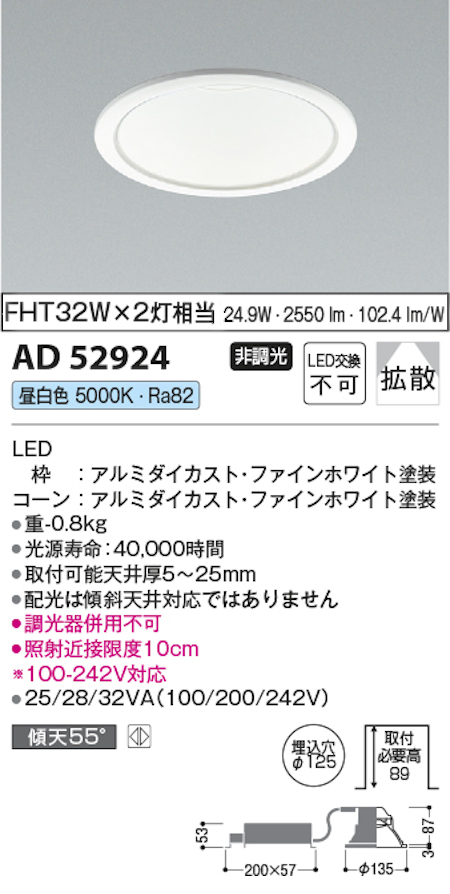 コイズミ照明 AD52924 M型コンフォートベースダウンライト 非調光 埋込穴Φ125 FHT32W×2灯相当 昼白色