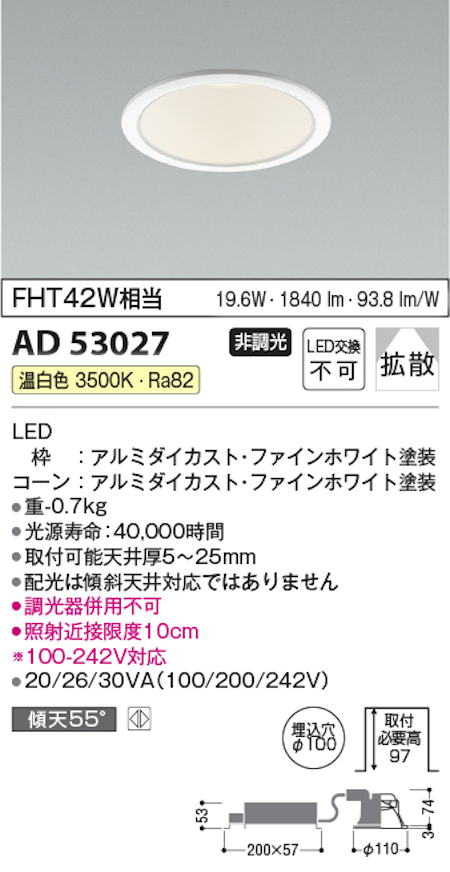 コイズミ照明 AD53027 M型コンフォートベースダウンライト 非調光 埋込穴Φ100 FHT42W相当 温白色