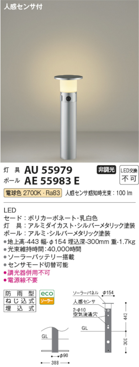 コイズミ照明 AU55979+AE55983E ソーラーパネル搭載ガーデンライト 400mmタイプ 色シルバーメタリック