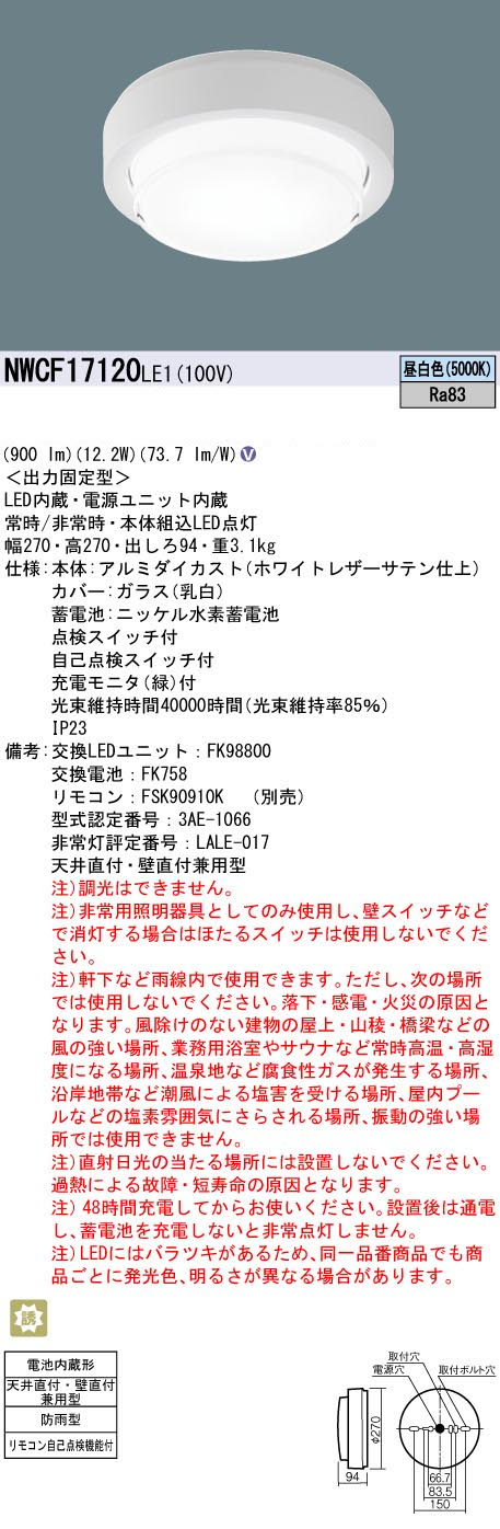 パナソニック NWCF17120LE1 防雨型シーリング階段灯 壁・天井直付型 フラット ホワイト高光束タイプ 900lm 昼白色