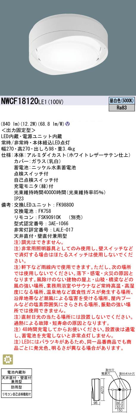 パナソニック NWCF18120LE1 防雨型シーリング階段灯 壁・天井直付型 フード ホワイト高光束タイプ 840lm 昼白色
