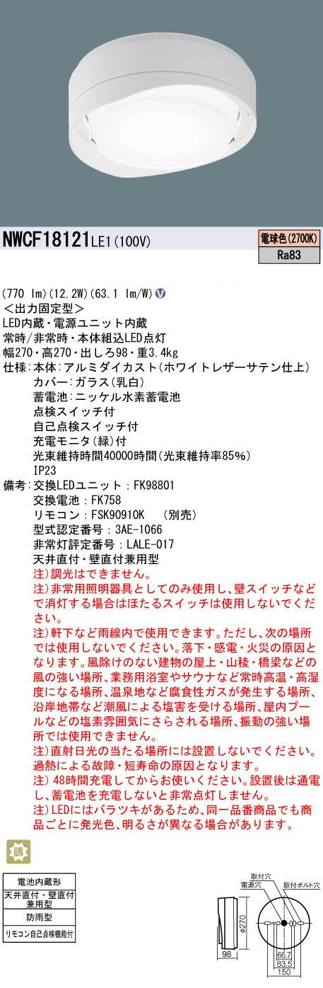 パナソニック NWCF18121LE1 防雨型シーリング階段灯 壁・天井直付型 フード ホワイト高光束タイプ 840lm 電球色