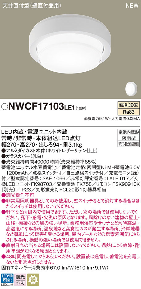 パナソニック NWCF17103LE1 防雨型シーリング階段灯 壁・天井直付型 フラット ホワイト低光束タイプ 610lm 温白色
