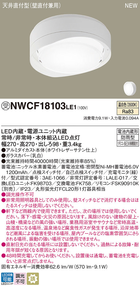 パナソニック NWCF18103LE1 防雨型シーリング階段灯 壁・天井直付型 フード ホワイト低光束タイプ 570lm 温白色