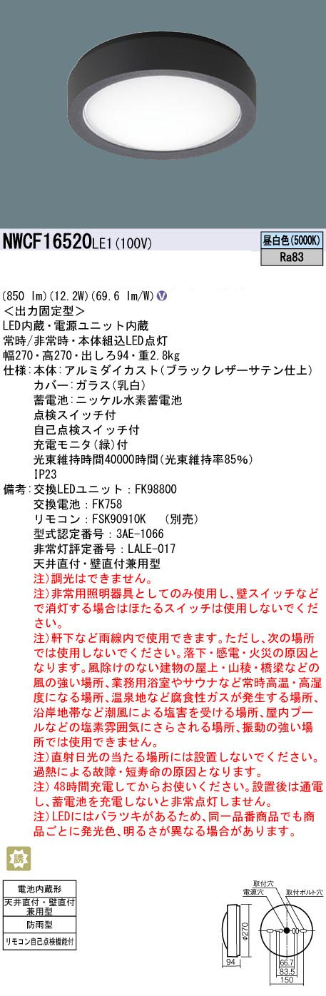 パナソニック NWCF16520LE1 防雨型シーリング階段灯 壁・天井直付型 ベーシック ブラック高光束タイプ 850lm 昼白色