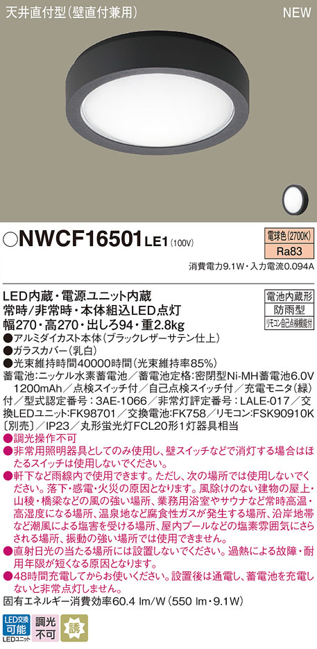 パナソニック NWCF16501LE1 防雨型シーリング階段灯 壁・天井直付型 ベーシック ブラック低光束タイプ 550lm 電球色