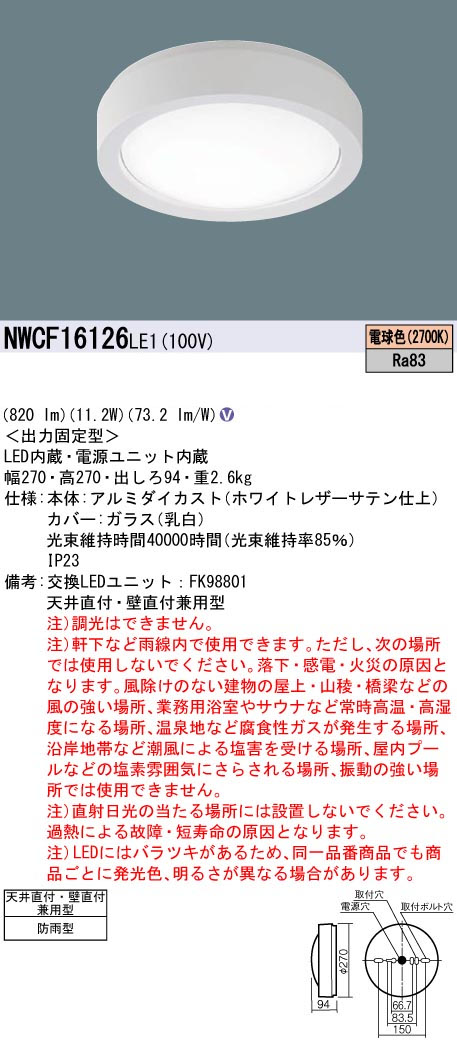 パナソニック NWCF16126LE1 防雨型シーリング階段灯 壁・天井直付型 ベーシック ホワイト 高光束タイプ 820lm 電球色