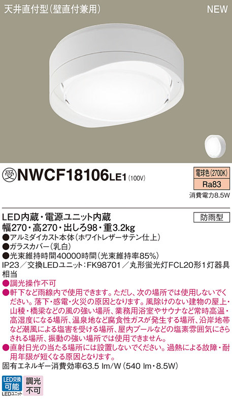 パナソニック NWCF18106LE1 防雨型シーリング階段灯 壁・天井直付型 フード ホワイト 低高光束タイプ 540lm 電球色
