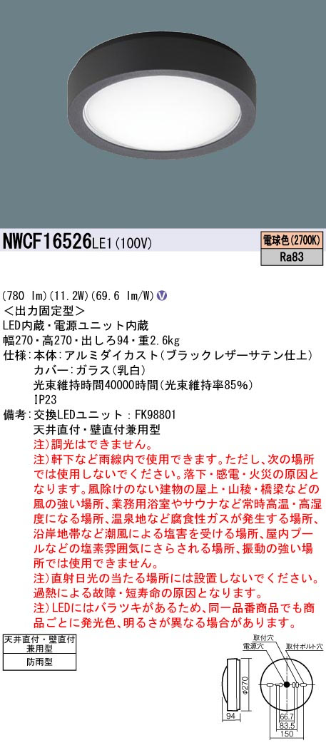 パナソニック NWCF16526LE1 防雨型シーリング階段灯 壁・天井直付型 ベーシック ブラック高光束タイプ 780lm 電球色